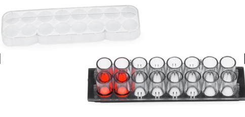蓋玻片上的腔室共16個(gè),分2排,各8孔(如圖示),每孔的內(nèi)直徑6mm。設(shè)計(jì)的每孔體積和孔距與標(biāo)準(zhǔn)96孔板的相同,無(wú)細(xì)胞毒性的硅膠孔墊片(silicone well gasket)與上層聚苯乙烯材料的腔室(the upper structure,厚0.5mm)和基層的硼硅酸鹽蓋玻片(the substructure,厚0.16-.19mm)形成滴水不漏的密封。有上層腔室時(shí)每孔體積250µl,去掉上層腔室后每孔體積9µl。